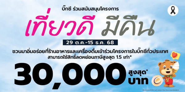 ขณะเดียวกัน ลูกค้ายังสามารถเพลิดเพลินไปกับความคุ้มค่าในโครงการภาครัฐ "เที่ยวดี มีคืน" ที่บิ๊กซีร่วมสนับสนุน เพื่อกระตุ้นการใช้จ่ายภายในประเทศ รับสิทธิลดหย่อนภาษีได้จริงสูงสุดถึง 30,000 บาท สำหรับลูกค้าที่รับประทานอาหารในร้านค้าชั้นนำที่ร่วมรายการทั่วประเทศ อาทิ MK, KFC, Swensens, Starbucks, The Pizza Company, Yayoi, Tim Hortons และอีกหลายร้านในศูนย์การค้าบิ๊กซี โดยลูกค้าสามารถขอรับใบกำกับภาษีเต็มรูปแบบได้ทั้งแบบ E-TAX และแบบกระดาษ เพื่อใช้สิทธิลดหย่อนภาษีได้ตามเงื่อนไขของโครงการ ตั้งแต่วันนี้ -15 ธันวาคม 2568