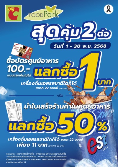 นอกจากดีลจากร้านค้าแล้ว บิ๊กซียังมอบความคุ้มค่าให้กับสายกิน กับโปรโมชั่น "สุดคุ้ม 2 ต่อ" ที่ศูนย์อาหารทั่วประเทศ เพียงซื้อบัตรศูนย์อาหารมูลค่า 100 บาท (แบบไม่แลกคืน) รับสิทธิ์แลกซื้อเครื่องดื่มเอสโคล่า 22 ออนซ์ เพียง 1 บาท หรือใช้ใบเสร็จร้านค้าในศูนย์อาหารแลกซื้อเอสโคล่าได้ในราคาเพียง 11 บาท จากราคาปกติ 22 บาท ตั้งแต่วันนี้ - 30 พฤศจิกายน 2568