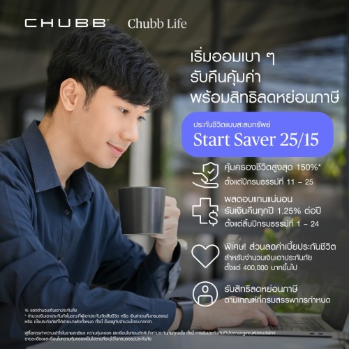 ชับบ์ ไลฟ์ ประกันชีวิต เปิดตัว 2 ผลิตภัณฑ์ประกันสะสมทรัพย์ใหม่ล่าสุด "โปร เซฟเวอร์ 20/10" และ "สตาร์ต เซฟเวอร์ 25/15" เพื่อตอบสนองความต้องการของคนไทยที่กำลังมองหาตัวช่วยในการวางแผนการเงินอย่างมืออาชีพ ที่มอบความคุ้มครองที่ครอบคลุม ผลประโยชน์ที่คุ้มค่า และการวางแผนภาษีโค้งสุดท้ายก่อนสิ้นปี