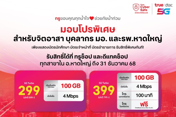 น้ำท่วมจากไป น้ำใจคงอยู่ ทรู–ดีแทค พร้อมดูแลชาวหาดใหญ่–สงขลา ด้วยสมาร์ทโฟนราคาพิเศษเริ่มเพียง 99 บาท หรือ แพ็กเกจรายเดือนลด 50% รับสิทธิ์ได้ตั้งแต่วันนี้ถึงสิ้นปี 68