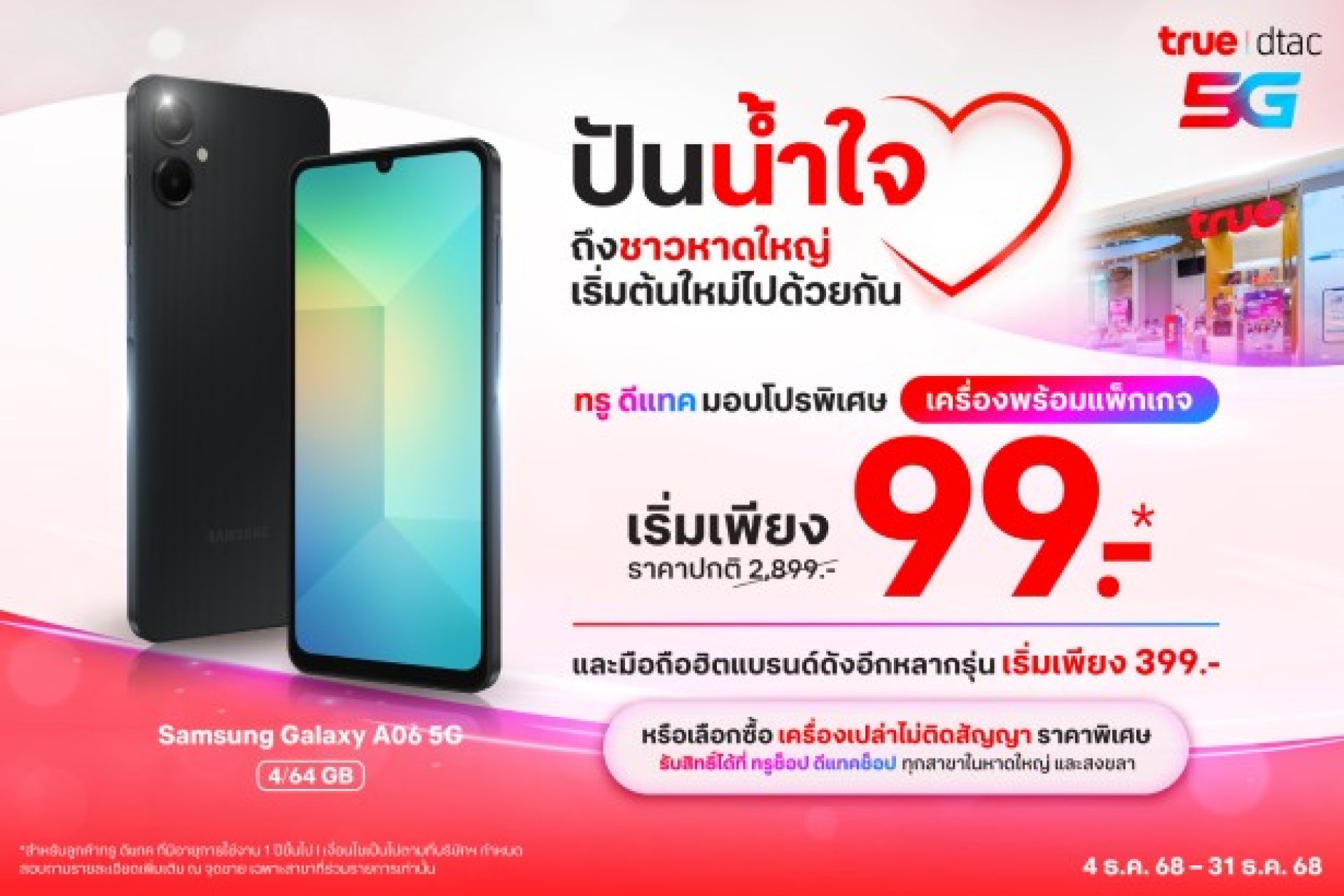 - Samsung Galaxy A06 5G เริ่มเพียง 99 บาท (ปกติ 2,899 บาท) พร้อมแพ็กเกจรายเดือน 599 บาท สำหรับลูกค้าทรูดีแทครายเดือนที่มีอายุการใช้งานตั้งแต่ 1 ปีขึ้นไป