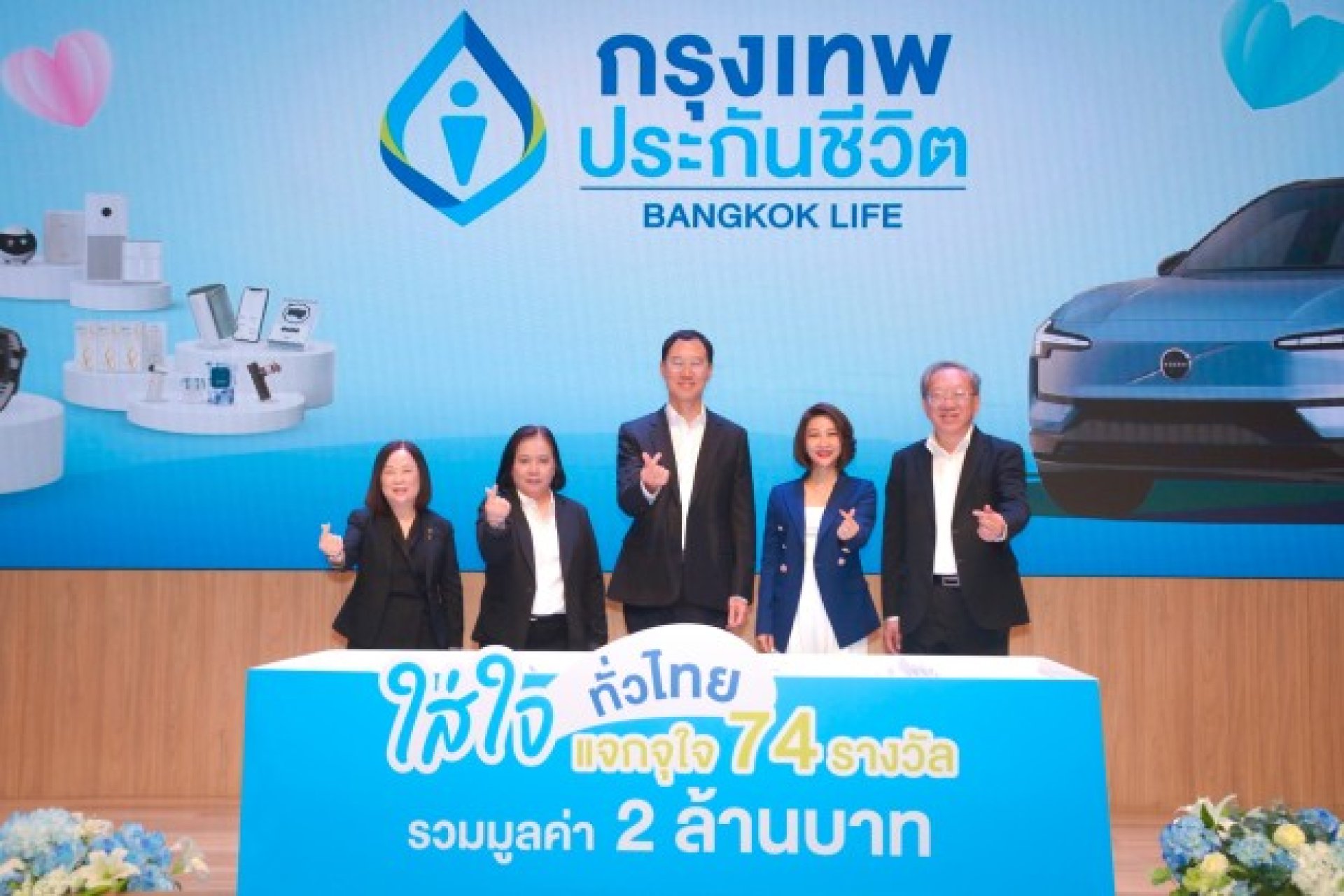 บริษัท กรุงเทพประกันชีวิต จำกัด (มหาชน) โดย นายโชน โสภณพนิช กรรมการผู้จัดการใหญ่และประธานเจ้าหน้าที่บริหาร นำทีมผู้บริหาร จับรางวัลแคมเปญใหญ่แห่งปี ใส่ใจทั่วไทย แจกจุใจ 74 รางวัล ฉลองครบรอบ 74 ปี โดยได้คัดสรรของรางวัลด้วยความใส่ใจต่อสิ่งแวดล้อม สุขภาพ คุณภาพชีวิตและความมั่งคั่ง มอบเป็นของขวัญให้แก่ลูกค้าที่ให้ความไว้วางใจให้กรุงเทพประกันชีวิตได้ดูแลตลอดมา ทั้งหมด 74 รางวัล รวมมูลค่า 2 ล้านบาท อาทิ รถยนต์ไฟฟ้า Volvo รุ่น EX30 Ultra โทรศัพท์มือถือ iPhone รุ่น 16 Plus ทองคำ นาฬิกาสมาร์ทวอทช์ ณ บริษัท กรุงเทพประกันชีวิต จำกัด (มหาชน)