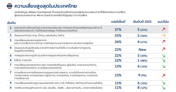 Allianz Risk Barometer 2026 เผย ท็อป 3 ความเสี่ยงภาคธุรกิจไทย “ภัยไซเบอร์” รั้งอันดับหนึ่ง ตามด้วยภัยพิบัติจากธรรมชาติ และ ปัญหาสภาพภูมิอากาศ